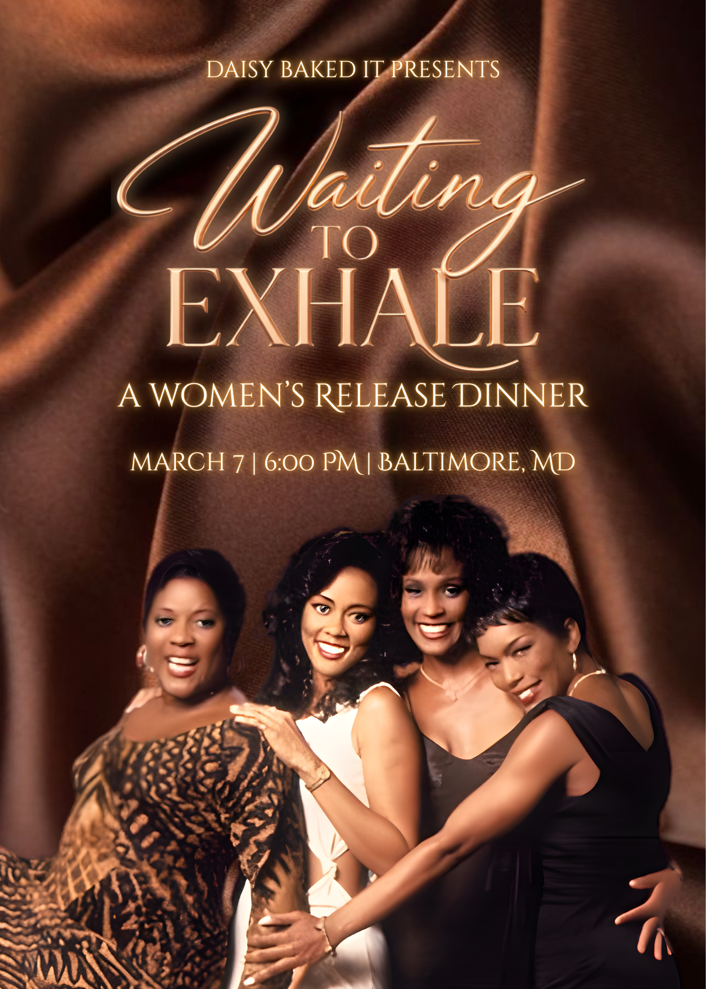 Join us for an elevated dinner experience inspired by the iconic film Waiting to Exhale. Taking place the weekend of Internationl Women's Day, this elevated evening invites you into an atmosphere of warmth, intention, and sisterhood. Guests will enjoy a luxe dinner experience featuring guided cake decorating, our delicious Daisy Baked It cupcakes, cocktails, and the soulful sounds of a live saxophonist.